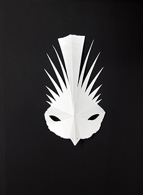 C’est une série de masques faite sur un même modèle d’origami. Chaque jour depuis l’obligation du port du masque dans les lieux publics, j’imagine une nouvelle figure, expression de mon humeur, de mes revendications ou l’envie de me transformer … en créatures venus d’ailleurs ou d’un autre temps. Présentés ici sous leur forme la plus brute, les masques feront bientôt l’objet d’invitations auprès de 30 créateurs pour être grimer. Réalisation en papier chiffon fabriqué au MOULIN À PAPIER RICHARD DE BAS à Ambert, 63. Masquarade – 1. VERB. To masquerade as someone or something means to pretend to be that person or thing, particularly in order to deceive other people. 2. COUNTABLE NOUN. A masquerade is an attempt to deceive people about the true nature or identity of something. 3. COUNTABLE NOUN. A masquerade is an event such as a party or dance where people dress up in disguise and wear masks.
