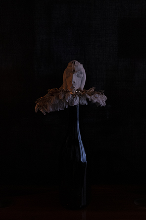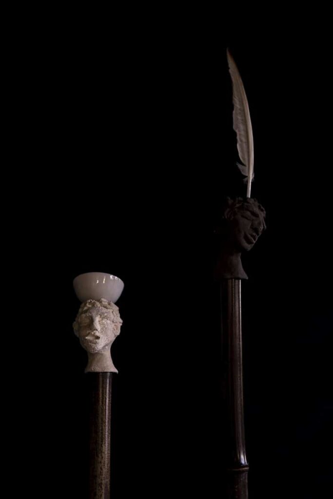 Objets en gré et porcelaine, verre, laiton, bambou, cire, plume, végétal. Objects in stoneware and porcelain, glass, bamboo, wax, feathers, plants.