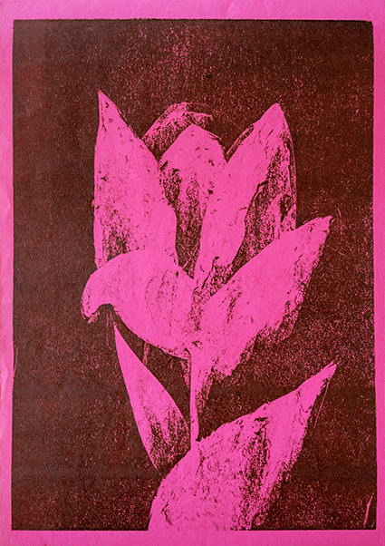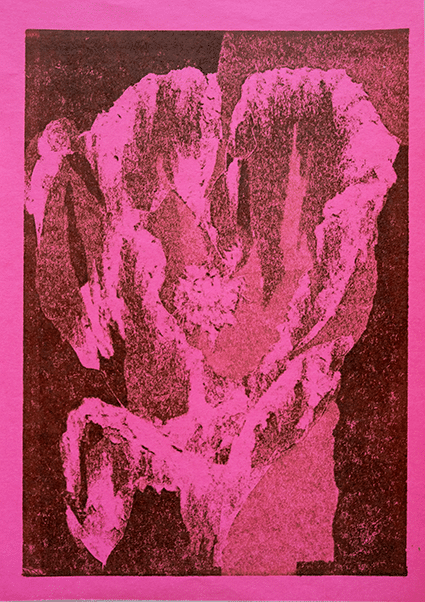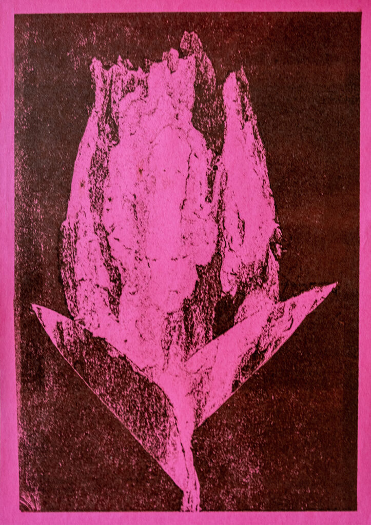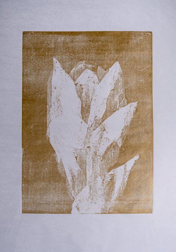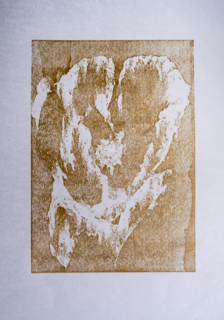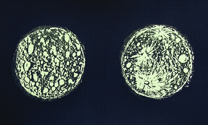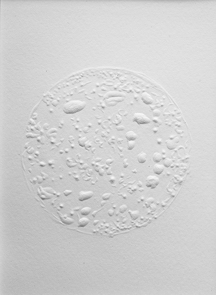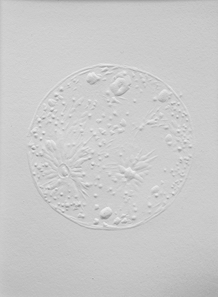 La lune et sa face cachée, embossage format 12 x 15 cm / papier 300 gr. puis sérigraphies phosphorescentes tirées à 50 exemplaires + fleurs gravées, imprimées sur papiers couleur/sulfurisé (encre dorée) 30 x 40/50 cm. The moon and its hidden face, embossing on 300 gr. paper 12 x 15 cm then phosphorescent screen prints in an edition of 50 copies + engraved flowers, printed on colored or greaseproof paper 30 x 40 cm.