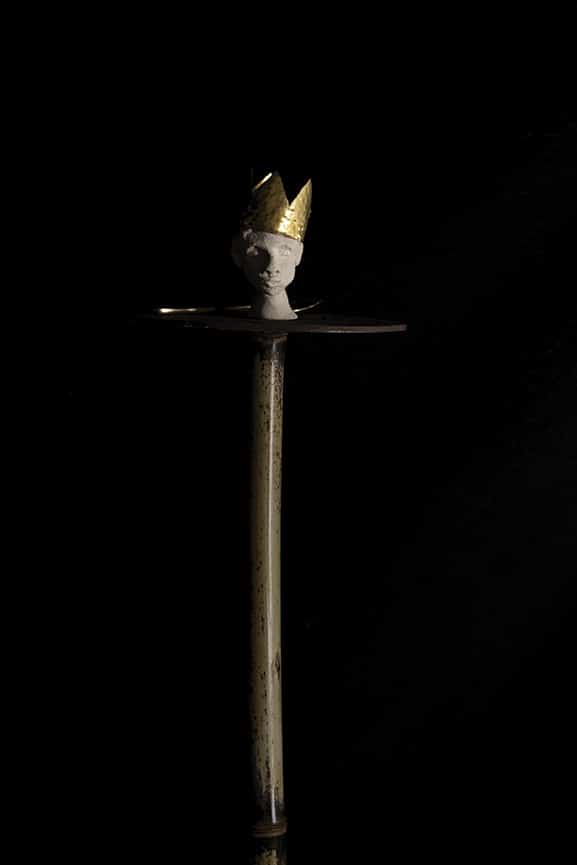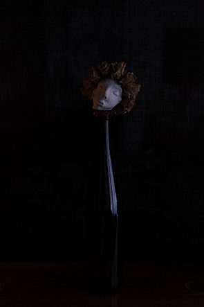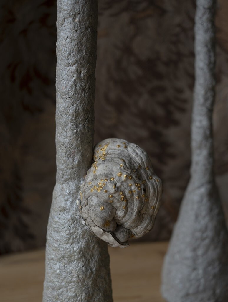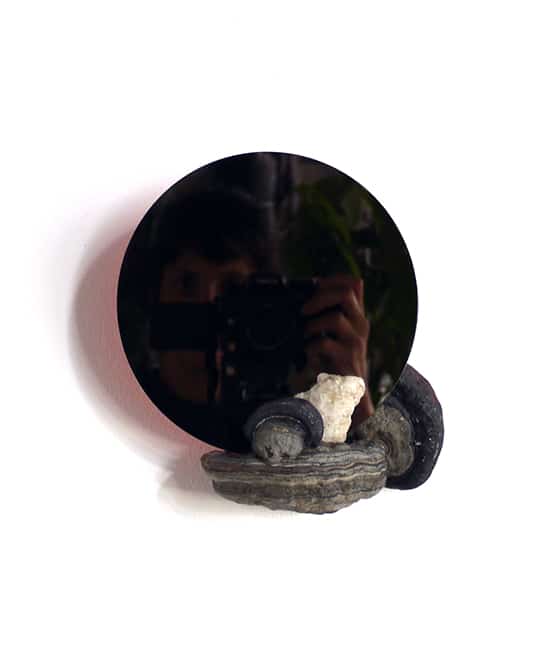 Des sculptures faites de choses glanées dans la nature et assemblées à des objets recyclés : champignons de souche, dents, papier mâché, miroir, grés. Sculptures made from things gleaned from nature and assembled with discarded objects : stump mushrooms, tooths, paper, mirror, sandstone.